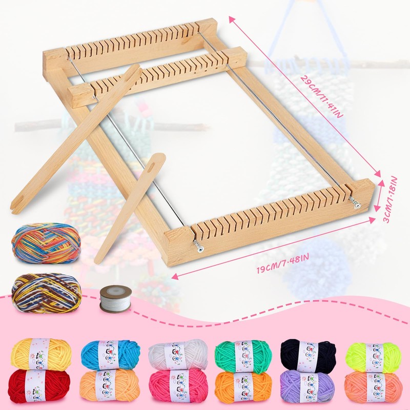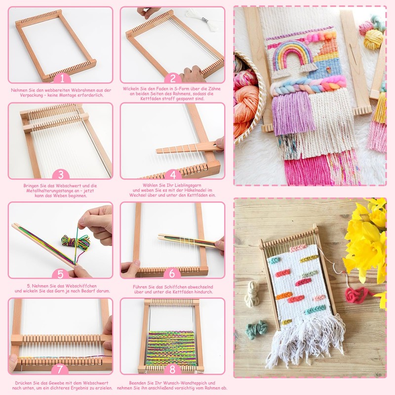 - Weaving frame for children and beginners: contains 1 loom frame, 2 ships, 12 colourful wool threads, 2 decorative yarns and a white fine thread. Beginners can start weaving immediately without having to buy additional material. The set encourages patience and concentration and provides valuable learning and growth experiences.