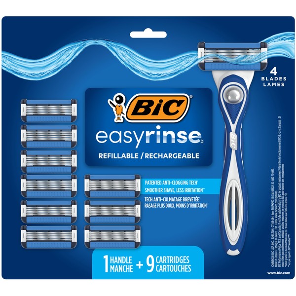 - One 10-piece BIC EasyRinse Anti-Clogging, Refillable Men's Razor kit with 1 handle and 9 razor cartridges for a smoother shave with less irritation*