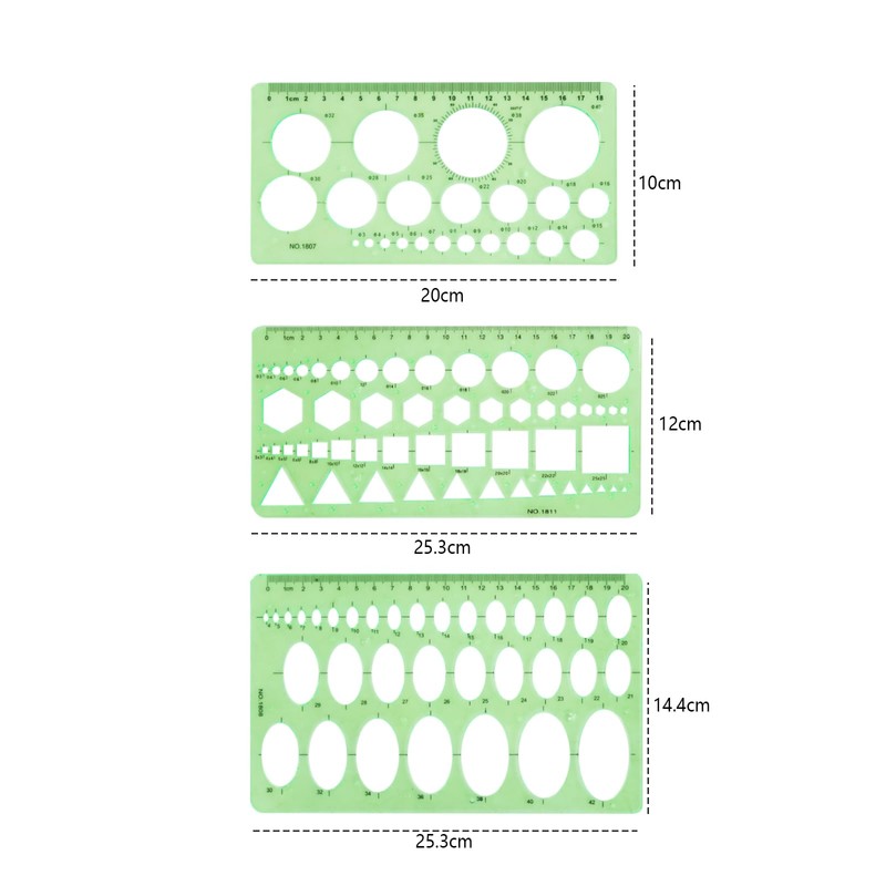 - Drawing Templates: There are 3 kinds geometric figure templates of different shapes, circle drawing template, ellipse template, big circle template, you can use them for drawing, design, construction, engineering, quilting, hobby, crafts, scrapbook, etc.