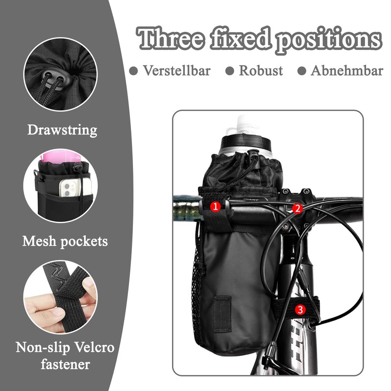 - Safe installation: thanks to the design with three Velcro straps, you can install bicycle drink holders without screws anywhere you like, be it on the handlebar, on the frame or elsewhere. The drawstring closure on the top of the bicycle cup holder can be quickly opened or closed, so you can easily access your water bottle at any time.