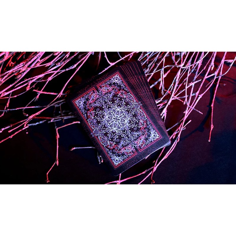 The deck features 100% original and custom type: faces, backs, court carts, box, and even the pips. Wrapped in elegance.