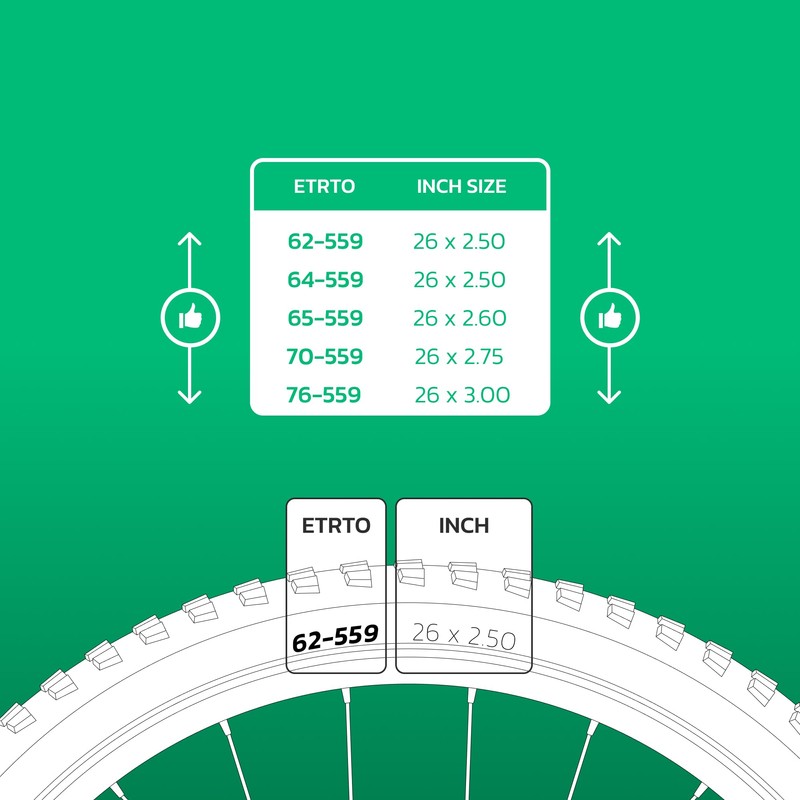 - Compatibility: These tubes are compatible with 26 inch tyres and fit the following sizes: 26 x 2.50 (ETRTO 62/64-559), 26 x 2.60 (ETRTO 65-559), 26 x 2.75 (ETRTO 70-559), 26 x 3.00 (ETRTO 65-559). TRTO 75/76-559). Perfect for VTTs, city bikes, folding bikes and trekking bikes.