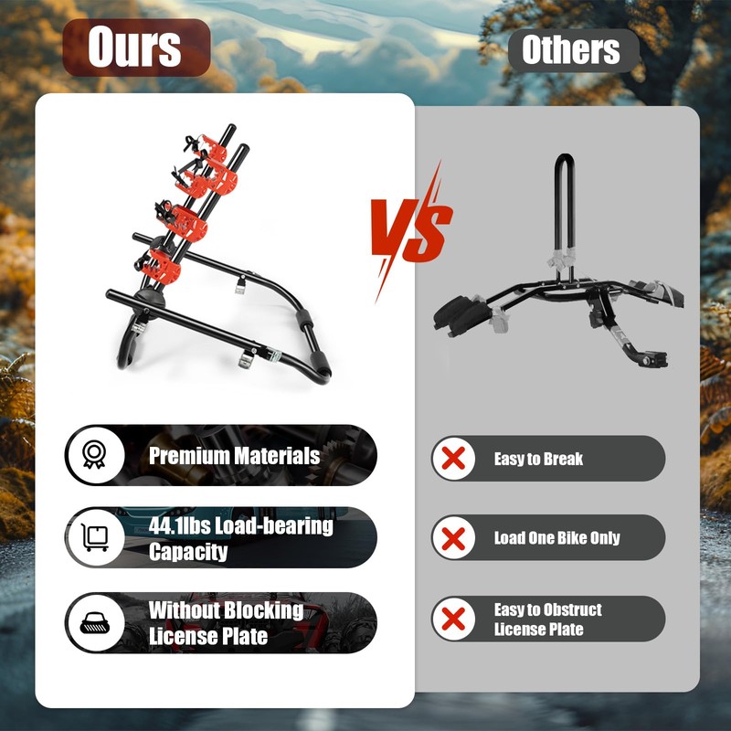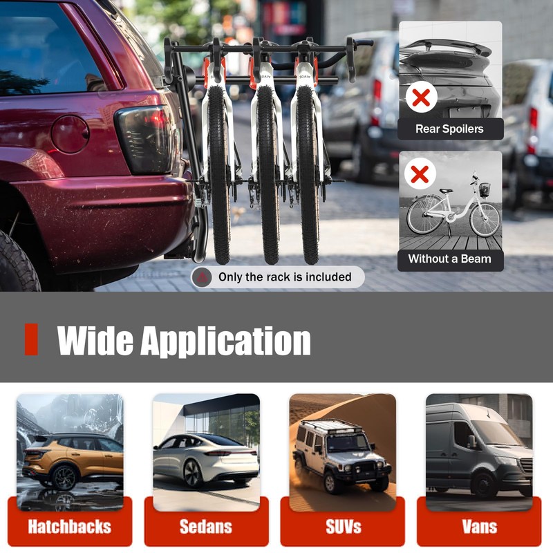 - Carrying Assistant: With a 44.1lbs strong load-bearing capacity, the bicycle carrier rack can safely carry three bicycles at once. Its adjustable straps and fixed slots can firmly secure your bicycles, making it easy to handle both family outings and group excursions