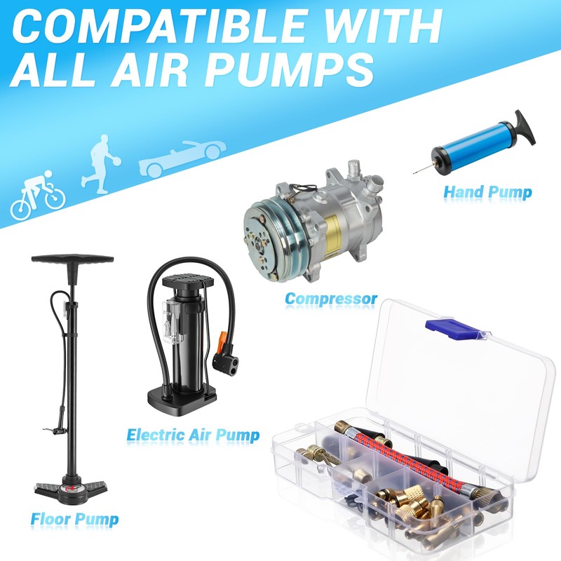 • Excellent universal performance: the 33-piece air pump adapter set is suitable for all standard valves, including automotive valve adapter (AV), French valve adapter (SV) and Dunlop valve adapter (DV). It can also be used as an air pump adapter or compressor adapter and can even be used to inflate your ball or air bed.