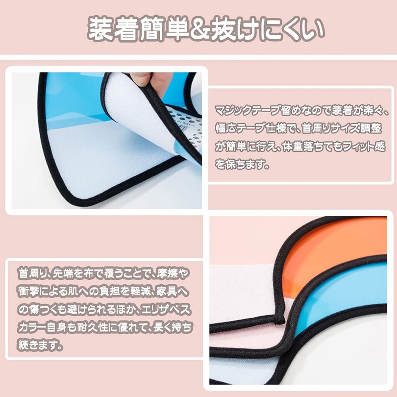 - 🐈【装着簡単&抜けにくい】マジックテープ留めなので装着が楽々、幅広テープ仕様で、首周りサイズ調整が簡単に行え、体重落ちてもフィット感を保ちます。強い接着力で抜けにくく、ポリプロピレン(PP)素材でよだれの拭き取りもやすい。首周り、先端を布で覆うことで、摩擦や衝撃による肌への負担を軽減、家具への傷つくも避けられるほか、エリザベスカラー自身も耐久性に優れて、長く持ち続きます。