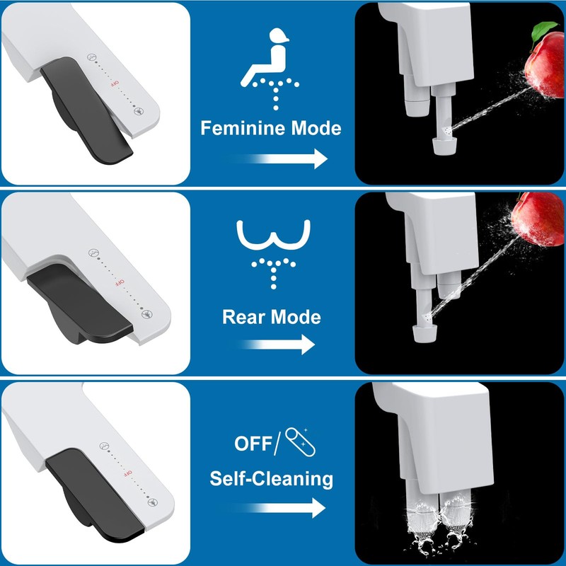 - Dual Spray Rods & Multi-Function Modes: Our Bidet Attachments feature dual spray rods to tailor your experience. Choose a gentle stream for daily use, a focused spray for thorough cleaning, or adjust the pressure to match your preference—perfect for post-partum care, sensitive skin, or anyone seeking a more personalized routine. No more compromising on comfort—this bidet works with your body, making hygiene feel less like a chore and more like self-care.
