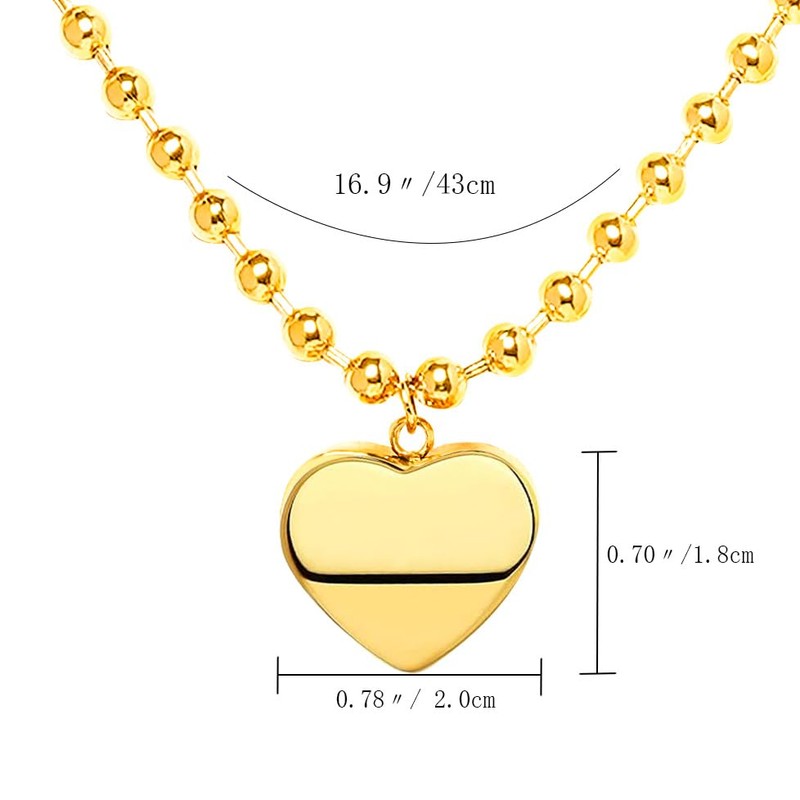 Bidgutory 18K Gold Stainless Steel Bead Chain Necklace for Women, Heart Pendant, Valentine's Day Birthday Mother Gift (Gold)