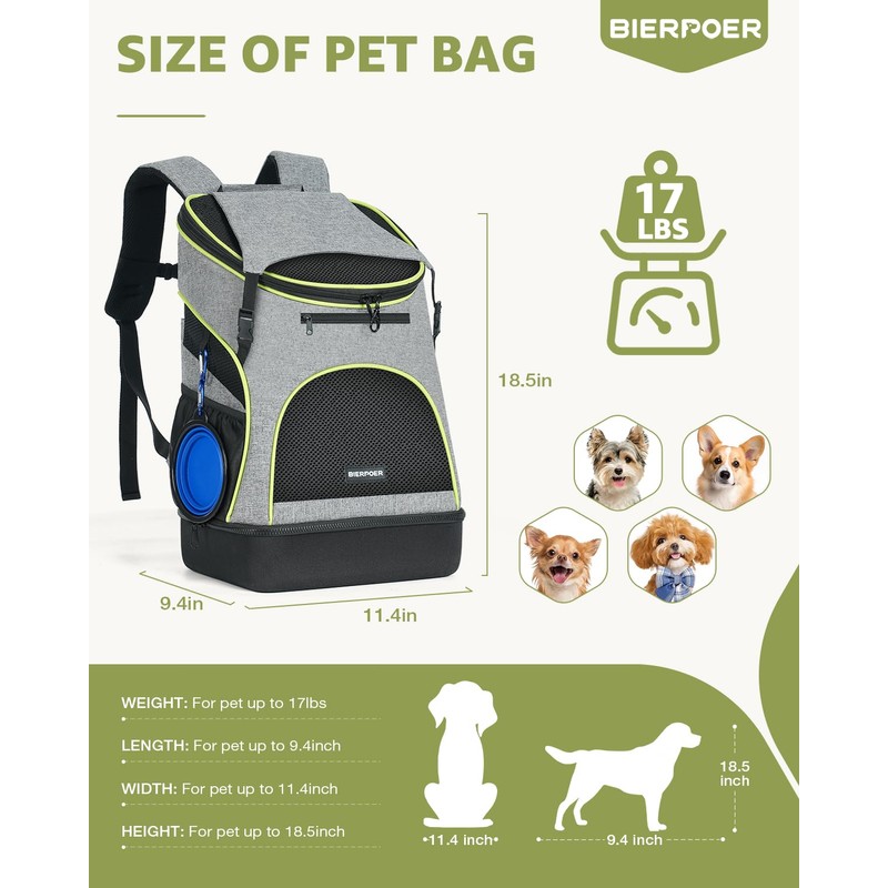 - Dog carrier backpack:This BIERPOER Dog Backpack Carrier measures 9.4"L * 11.4"W * 17.5" H. It's suitable for cats, dogs, and small animals weighing no more than 17 pounds. With a relatively large interior space, it provides pets with ample room to move around.