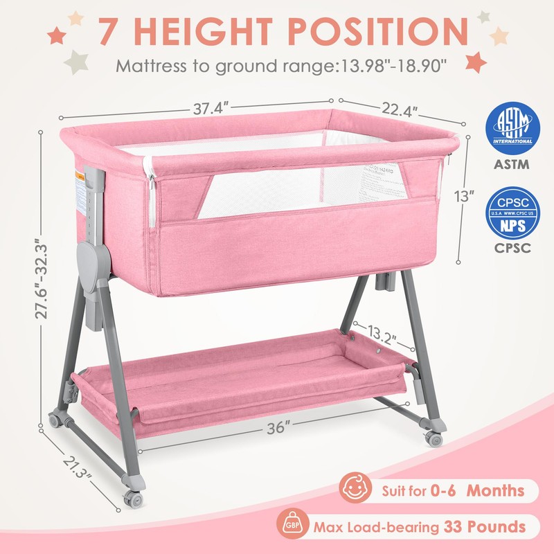 - 7 Adjustable Heights & Single-sided Angle: BIERUM Bedside bassinet features scientific seven gear adjustment levels(14-18.9 inches from bassinet mattress to the ground). Not only limited to the bedside, but also suitable for all kinds of sofas, or other places. This will make it easier for you to care for your baby, even in the middle of the night. The newborn bedside crib also has a practical design. After feeding the baby, you can adjust the angle to prevent the baby from spitting milk.