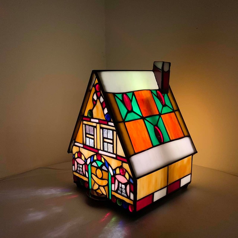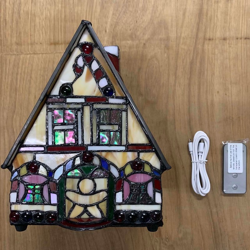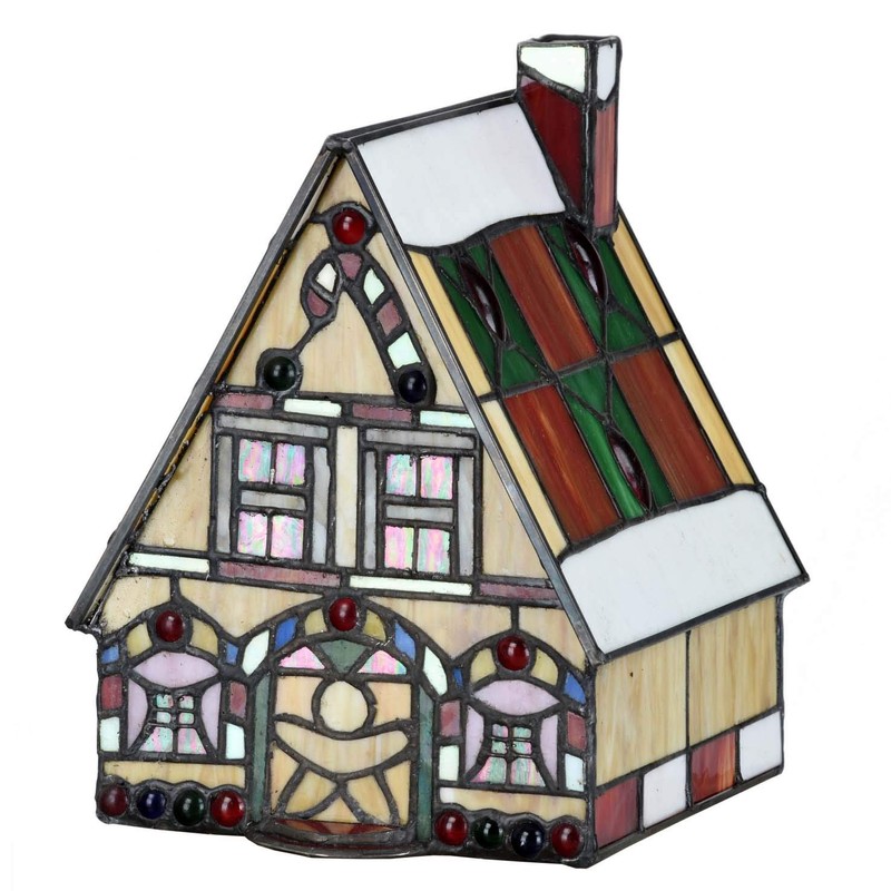 Bieye L10677 Gingerbread House Tiffany Style Stained Glass Accent Table Lamp with LED Light Inside, 7" L x 6" W x 9" H
