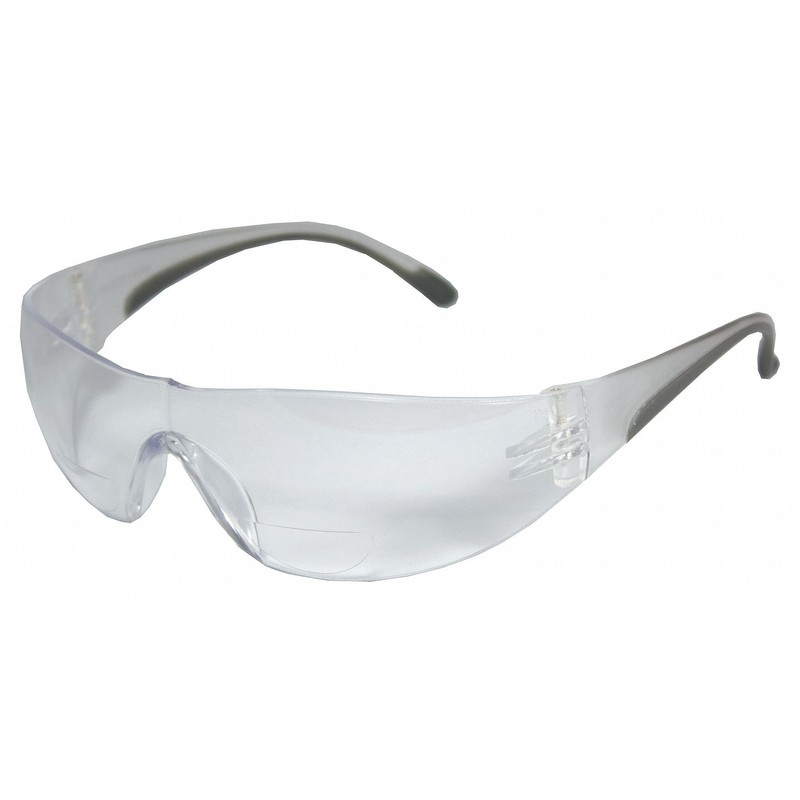 Bifocal Reading Glasses, +1.25 Diopter, Clear Lens Color, Scratch-Resistant Lens Coating, Wraparound Frame Design, Polycarbonate Frame Material, Polycarbonate Lens Material, Clear Temple Color, Spatula Temple Style, 99.9 Percent UV Protection, Venting No, X-Ray Detectable No, Standards ANSI Z87.1+, Safety Glasses Frame Style Frameless, Safety Glasses Size Universal, Foam Lined No '