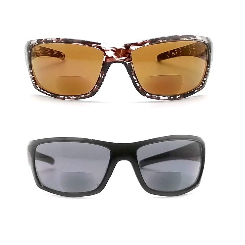 **Enjoy the outdoors in style and comfort with sports bifocal sunglasses for fashion and function.Apretyew bifocal sunglasses are great for reading and all of your other outdoor activities as well as driving. All styles provide 100% UV protection from the sun's harmful rays.The frame is lightweight.** **Sports Bifocal Sunglasses Specification:** Frame and Temples: Camouflage brown PC;Shiny black PC; Lens type: Brown Bifocal PC lenses;Smoke Bifocal PC lenses; Lens Material: Plastic; Lens width: 2.36"; Lens height: 1.57"; Bridge: 0.6"; Temple length: 5.12"; **What You Get:** 2 Pair sports bifocal reading sunglasses 2 Cleaning Pouch **Strengths Available:** +1.50, +2.00,+2.50,+3.00
