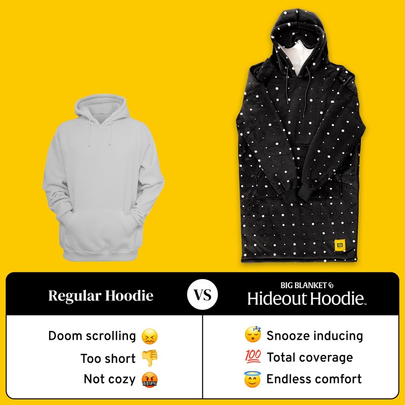 Never leave the comfort of a cozy blanket with the Hideout Hoodie the best-selling blanket you can wear. This oversized, one-size-fits-most hoodie includes cozy extras like a built-in eye mask, silky-soft sherpa lining, zippered kangaroo pouch, and cuffed sleeve with thumb holes for oh-la-la lounging. Made with Big Blanket Cos proprietary Original Stretch polyester-spandex blended fabric on the outside and the specially-designed, ultra-plush and smooth sherpa lining on the inside, this hoodie feels even better than it looks. built-in eye mask offers uninterrupted relaxation, the zippered kangaroo pouch fits all the essentials like your phone and snacks, while the cuffed sleeves with thumb holes give that extra cozy, tucked-in feel. With unisex XXL sizing, its a great fit for almost everyone! Plus, its machine washable and wrinkle-resistant, so its as easy to care for as it is to wear. Available in a range of colors, the Hideout Hoodie is not just a hoodieits your personal retreat, your everyday escape into comfort.