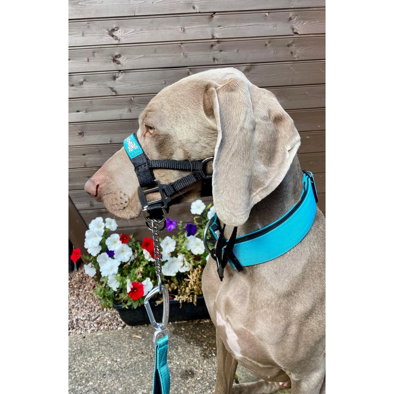 Handmade in the UK from extremely strong padded webbing and lined with wet suite quality neoprene, for comfort and to stop chaffing and fur loss. They have high quality stainless steel fittings and a 4mm thick martingale chain where the lead connects to the collar, this stops your dog chewing through the base of the head collar. The loop under the chin gently closes around your dogs muzzle when they pull, allowing the handler to have total control over the dogs head and therefore the direction they go.