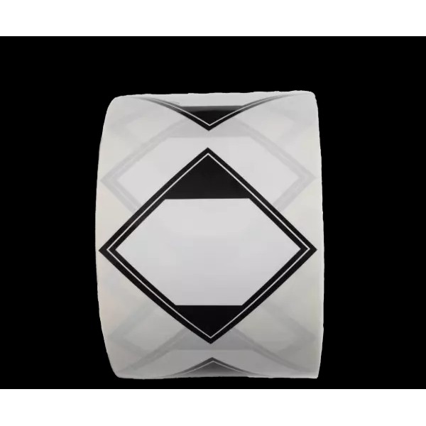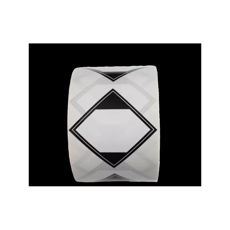 These 500 glossy black and white labels are 2.25" wide by 2.25" tall on a roll that is 3 3/8 by 4 7/8 inches. These labels have no text.