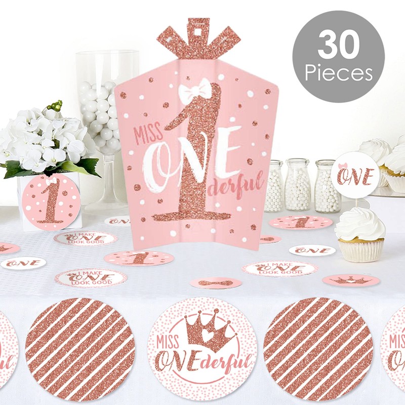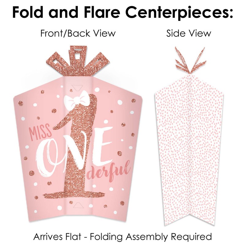 - 1st Birthday Little Miss Onederful Terrific Table Centerpiece Kit INCLUDES 27 paper confetti and 3 fold and flare centerpieces that will look amazing at your Girl First Birthday Party. Make a statement at your celebration with this easy DIY table kit!