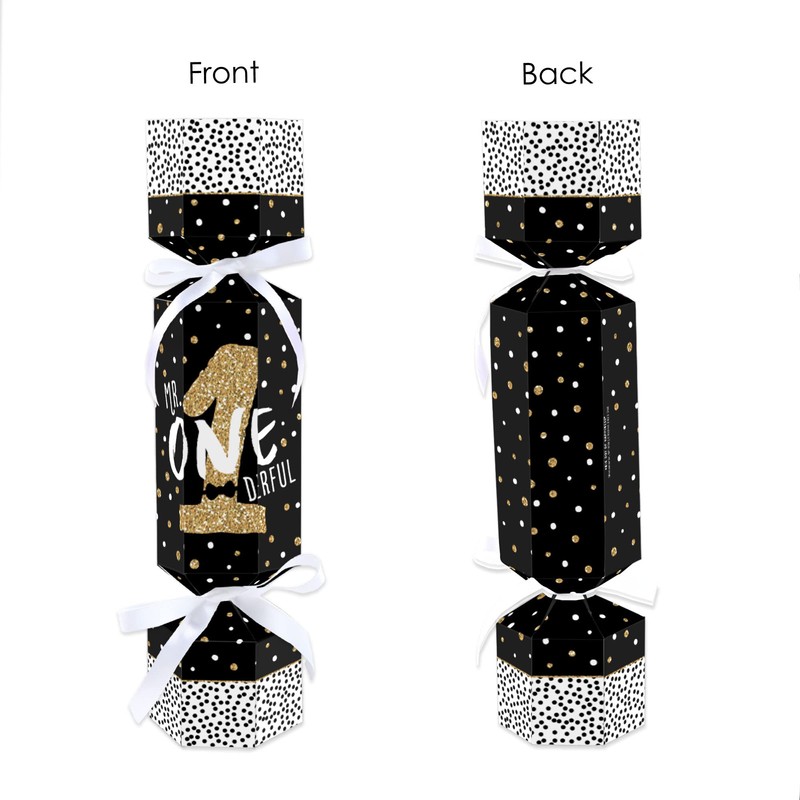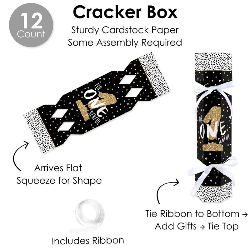 • 1st Birthday Little Mr. Onederful Cracker Boxes includes 12 DIY party favor boxes and coordinating satin ribbon. No-snap crackers are a unique favor box that will make your Birthday Party unforgettable!