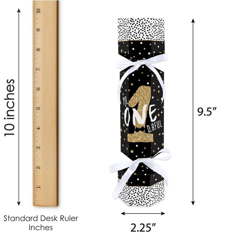 • High-Quality Supply: 1st Birthday Little Mr. Onederful crackers are professionally printed double-sided on heavy-duty cardstock paper with a photo-like shine. When assembled, 1st Birthday Little Mr. Onederful party crackers measure 2.25” wide by 9” tall. Cracker favor boxes will arrive flat with some assembly required. Candy not included.