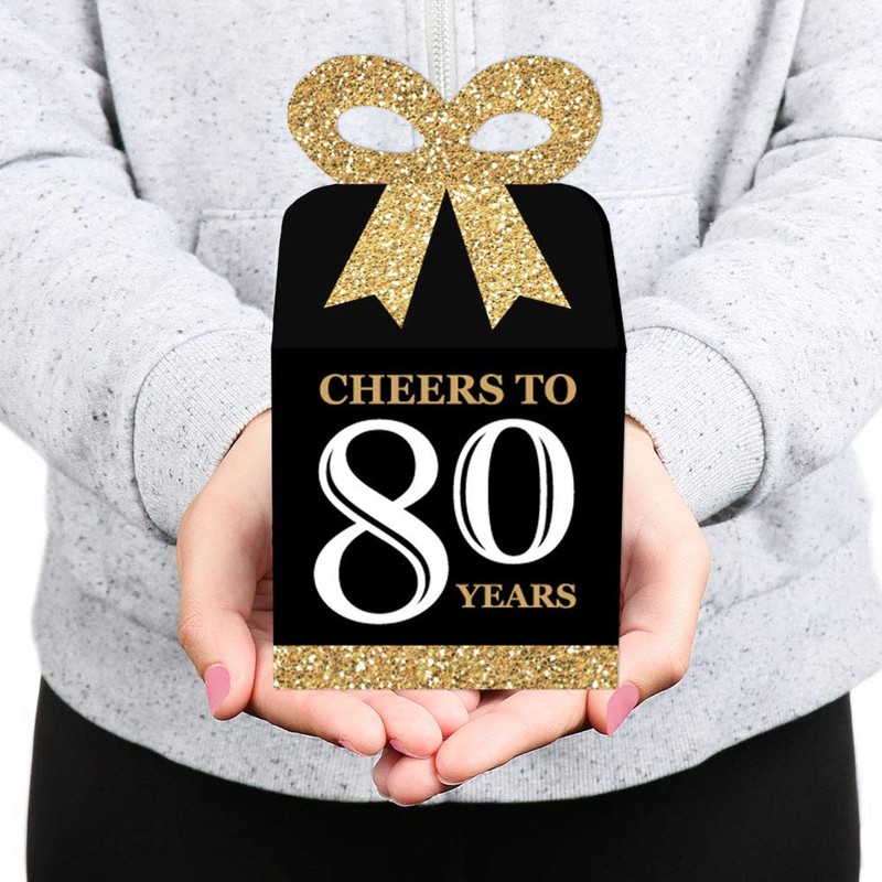 - CUTE GIFT BOXES: This small, closed favor box can be filled with homemade treats (fun cupcake box), party trinkets, or thank you gifts. At the party, have each guest fill their Adult 80th Birthday - Gold bow box with snacks from a candy buffet or use as a party loot box. Guests will have fun guessing what surprise each favor gift box contains.