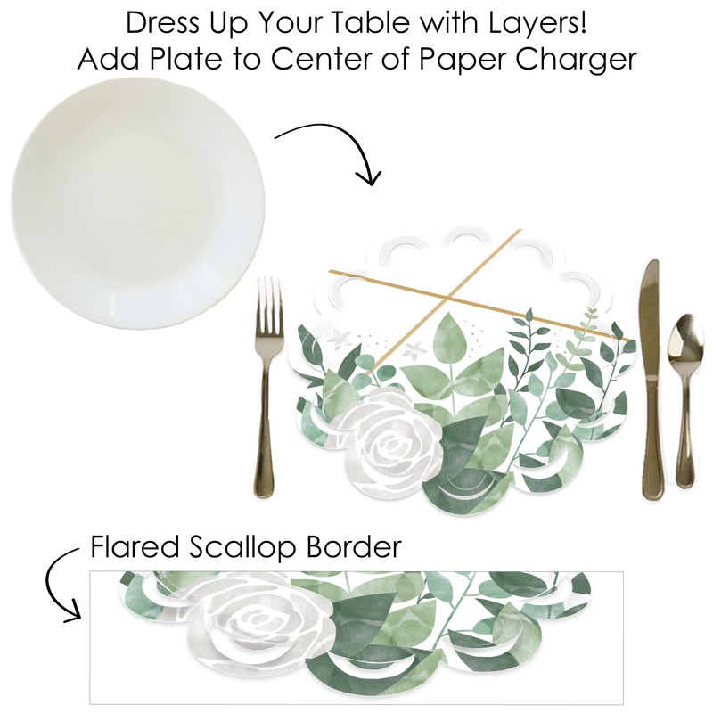• Boho Botanical Paper Chargers INCLUDES set of 12 reversible round table decorations. Create an exciting look at your Greenery Party when you use paper chargers to elevate your table setting and accent your dinnerware.