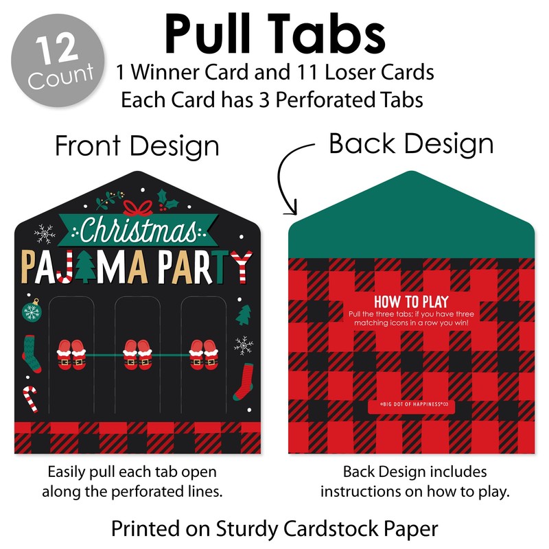 - Christmas Pajamas Pull Tabs 3-in-a-Row INCLUDES 12 pull tab game cards with 1 winning card and 11 losing cards. Great for a holiday plaid pj party, these game cards are for entertainment purposes only.