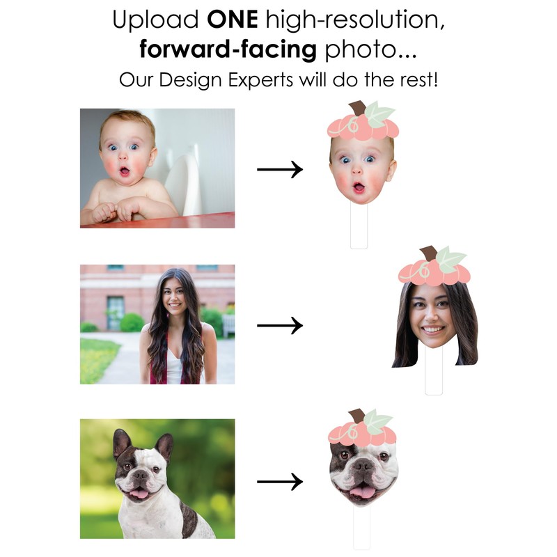 - Photo Tips: Your custom face final product will look best if you follow these tips. 1: Upload ONE high-resolution, forward-facing photo with a minimum of 150 dpi. 2: Unedited, original photos work best. Screenshots and far-away or zoomed photos will not print well. 3: Cell phone photos are OK if they are closeup and uploaded at the original file size. 4: Do not use images with hands near the face or poses with props. 5: Photos will NOT be touched up so upload your best image.