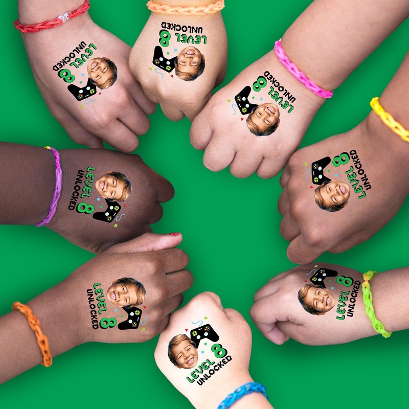 - The Custom Photo Video Game Birthday Temporary Tattoos INCLUDES a set of 12 tattoos that are a great party favor addition to any video game birthday party.