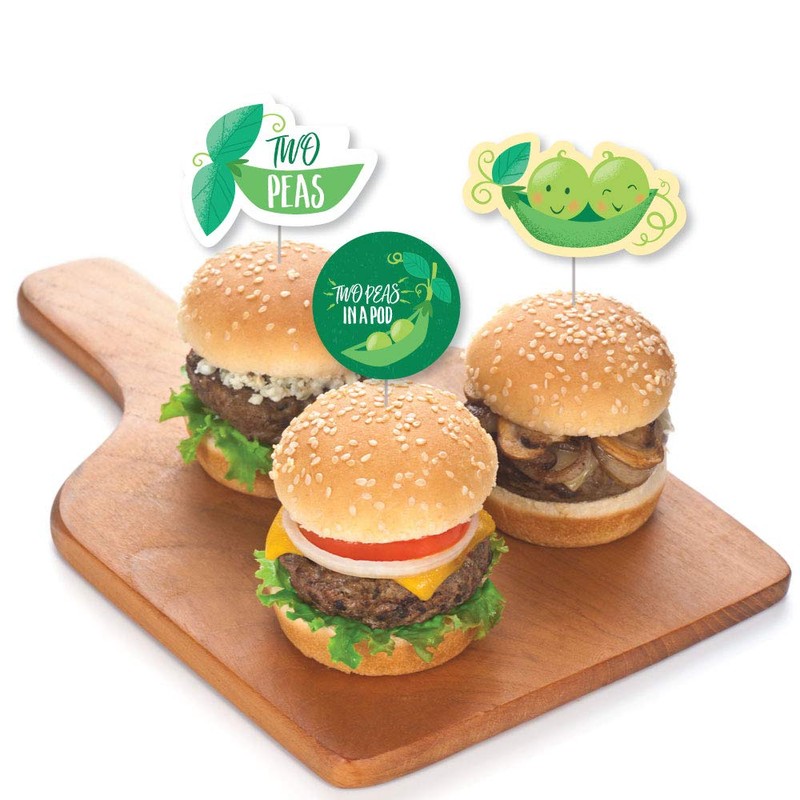 - EASY PARTY DECORATIONS: Double The Fun - Twins Two Peas in a Pod Baby Shower or Birthday party picks make it easy to style pea pod theme party. Create impressive cupcake towers with decorated treats placed on a tiered stand at the candy buffet table, style adorable tables with individual cupcakes at each place setting, or make creative centerpieces using decorated treats and a coordinating treat stand.