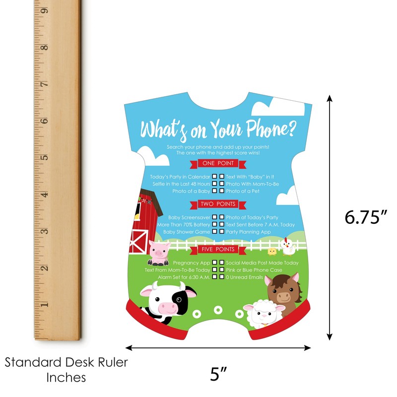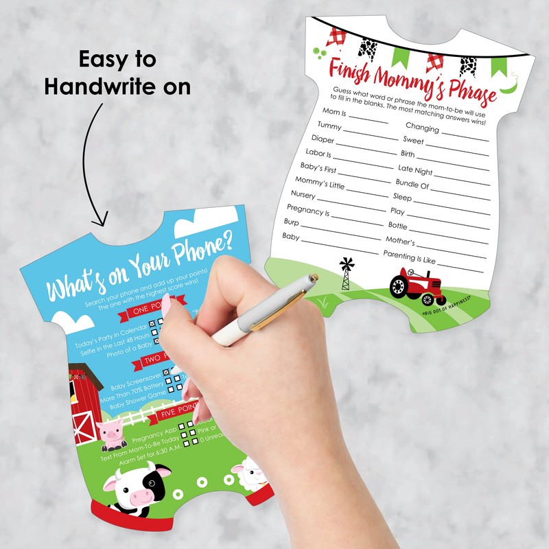 - Festive Fun: Add some entertainment to your celebration when you pass out the 2-in-1 Farm Animals activity cards. Each card is easy to handwrite on and features games What’s On Your Phone? and Finish Mommy’s Phrase.