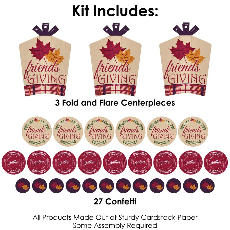 - Friends Thanksgiving Feast Terrific Table Centerpiece Kit INCLUDES 27 paper confetti and 3 fold and flare centerpieces that will look amazing at your Friendsgiving Party. Make a statement at your celebration with this easy DIY table kit!