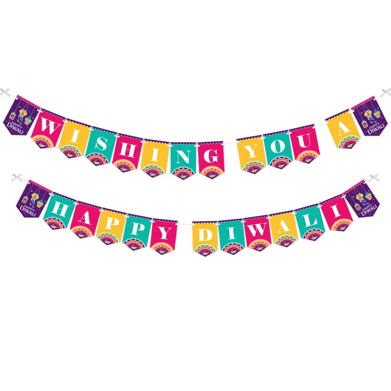 - Happy Diwali Bunting Banner is an impressive Festival of Lights party decoration for your party. Diwali Bunting Banner Decoration Kit INCLUDES WISHING YOU A HAPPY DIWALI letter pennants, Deepavali themed pennants, satin ribbon and non-marking wall mounts for hanging.