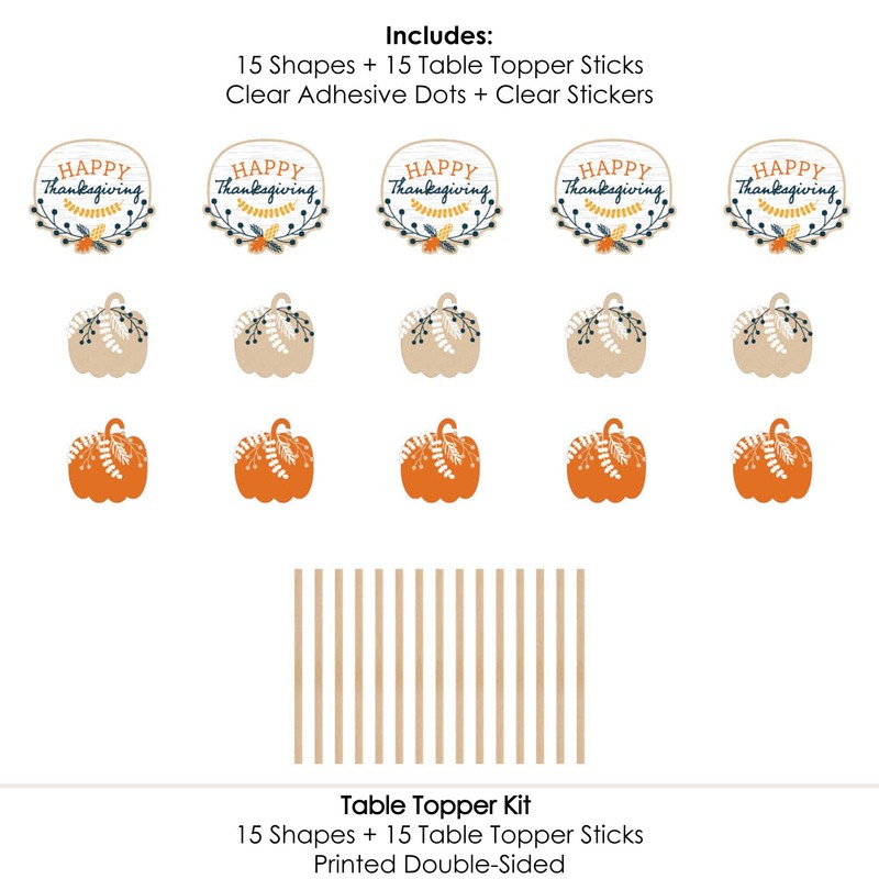 - Happy Thanksgiving Centerpiece Sticks INCLUDES 15 fall table toppers in three different shapes, 15 table topper sticks and stickers for easy assembly. Pumpkin party table decorations are perfect for a fall harvest event.