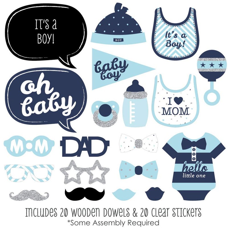 - 20-Piece Baby Shower Photo Booth Props Kit INCLUDES 20 Hello Little One - Blue and Silver photo booth props, 20 wooden dowel sticks and adhesives for assembly. EASY ASSEMBLY: Simply attach the printed DIY photo booth props to the wooden dowels with included adhesive and reinforcing stickers.
