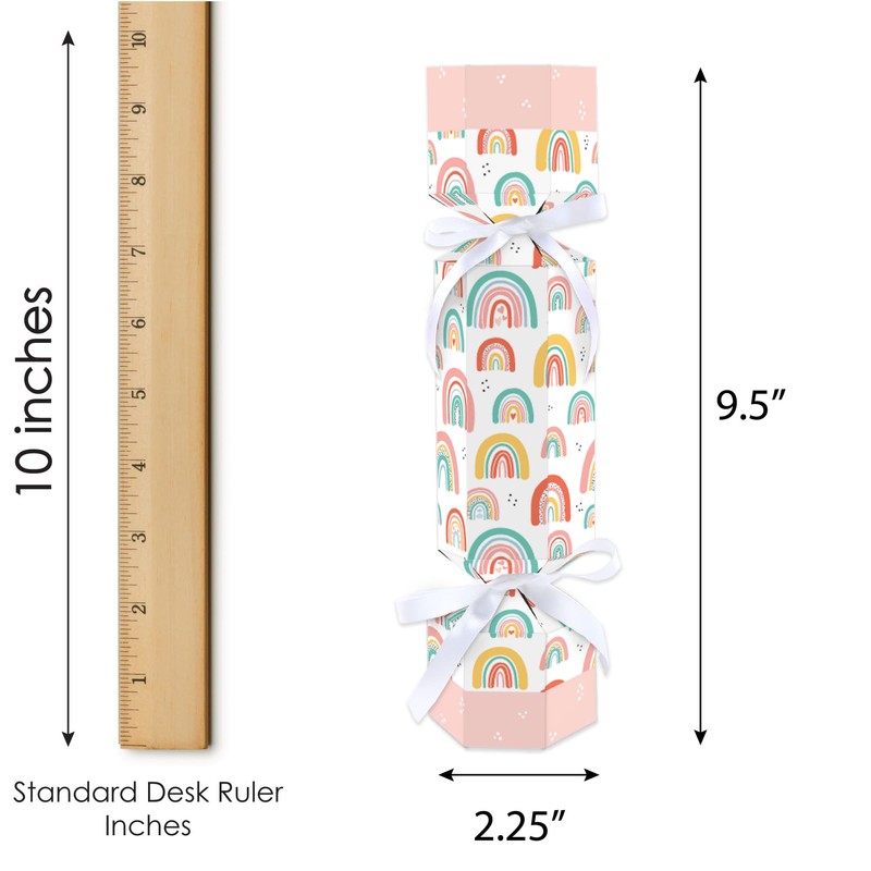 - High-Quality Supply: Hello Rainbow crackers are professionally printed double-sided on heavy-duty cardstock paper with a photo-like shine. When assembled, Hello Rainbow party crackers measure 2.25” wide by 9” tall. Cracker favor boxes will arrive flat with some assembly required. Candy not included.