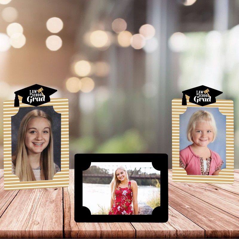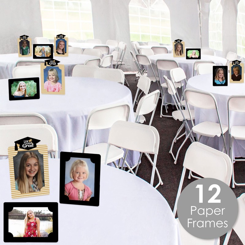 - Graduation Photo Display: Show off your guest of honor’s photos with the Law School Grad paper frames. Paper photo frames are perfect for displaying pictures on bookshelves, welcome tables, tablescape centerpieces, and fireplace mantel decorations.