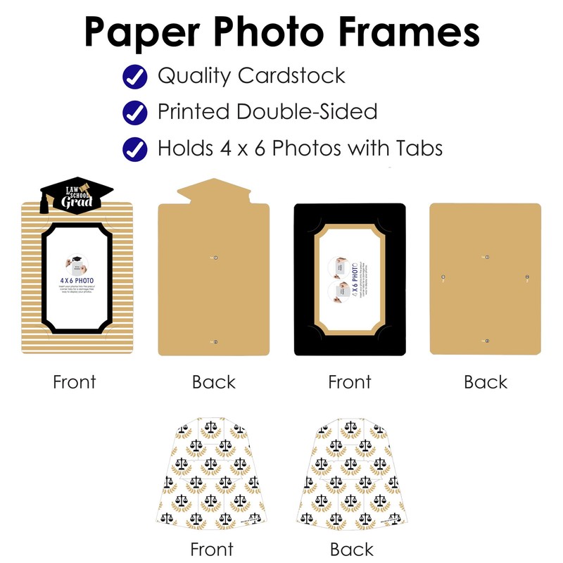 - Law School Grad Paper Photo Frames includes a set of 12 picture frames with stand that are suitable for 4x6 photographs. Six vertical frames come with a grad cap-shaped top and the other six frames come in a standard rectangular shape that can be displayed horizontally or vertically.