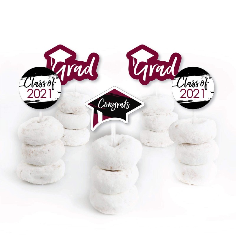 - PREMIUM PARTY SUPPLIES: Clear treat picks are made of food-grade plastic and packaged in a food-safe environment. The Maroon Grad - Best is Yet to Come paper cut out toppers are professionally printed on heavy-duty cardstock paper with themed art on one side and a coordinating pattern on the back. Cut outs will quickly attach to the clear dessert pick and then easily insert into your party appetizers or desserts.