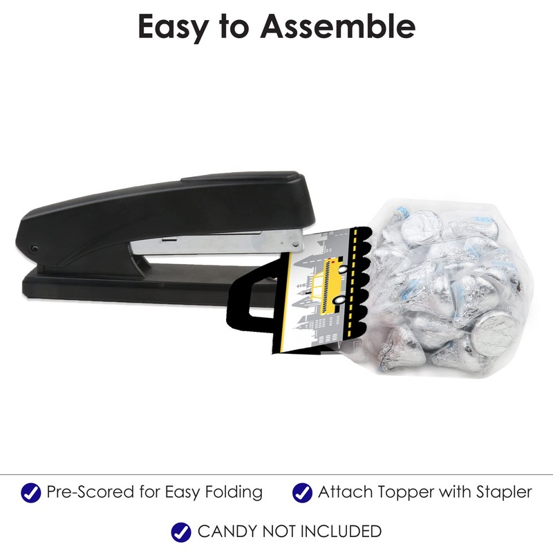 - Easy DIY: NYC Cityscape clear treat bags with topper labels require some easy assembly. Begin personalizing by filling out the To/From section on the backside of the topper and placing goodies inside the clear plastic bag. Next, fold along the pre-scored line to reveal the handle part. Place it over the opening of the goodie bag and staple to secure it shut.