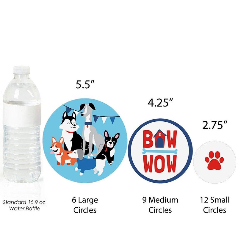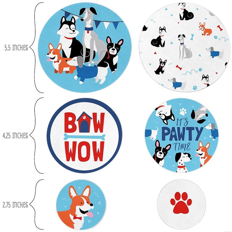 - Pawty Like a Puppy giant circle confetti SIZE 5.5 inches large circles, six qty; 4.25 inches medium circles, nine qty; and 2.75 inches small circles, twelve qty. The unique design and large size makes these boy puppy party decorations an impressive addition to any baby shower or birthday party.