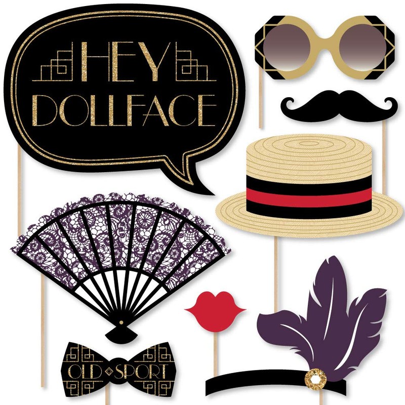 - HIGH-QUALITY PARTY SUPPLIES: Roaring 20's photo booth props are professionally printed on thick cardstock paper. They will arrive cut out and ready to assemble with the included wooden dowel sticks and adhesives. Roaring 20's photo booth props use a No-Mess Glitter Print: Our photo booth props are designed with a printed image of glitter, eliminating glitter flake while maximizing bling effect!