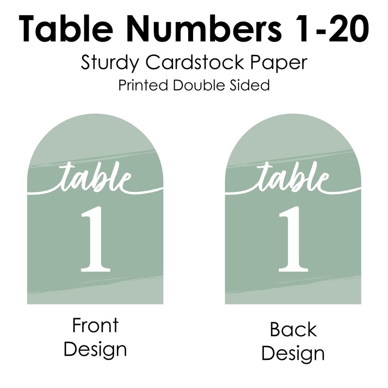 - STYLISH DESIGN: With crisp graphics and an elegant arch cut-out design, the Sage Green Elegantly Simple Table Numbers can be used at a variety of celebrations such as weddings, birthdays, baby showers, and more! Simply display by placing the removeable table number card with your own frame, stand, or holder to complete your look!