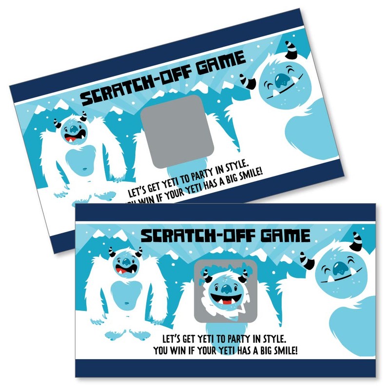 - Yeti to Party Scratch-Off Cards INCLUDES 22 abominable snowman game cards: 20 "loser" cards and 2 "winner" cards.