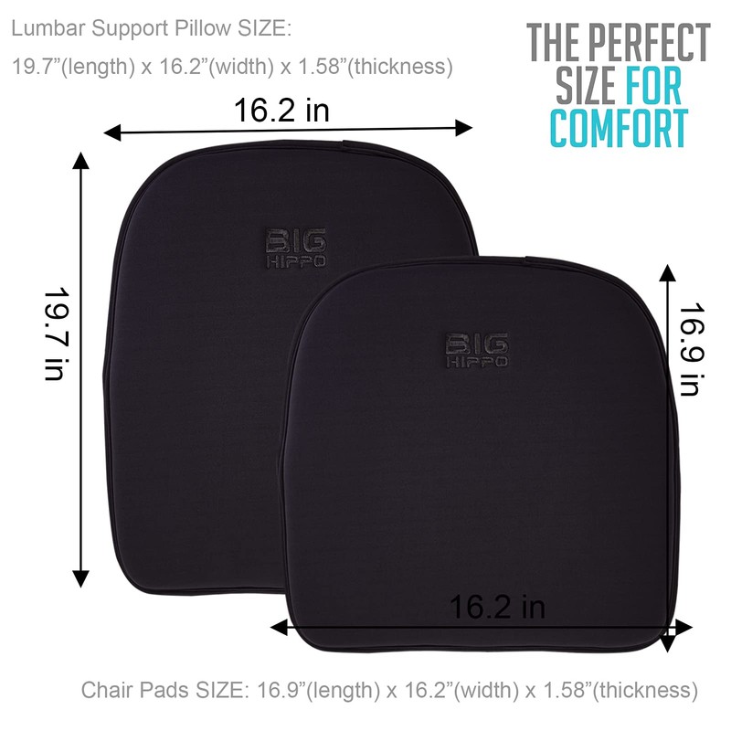 - √Suitable Size For Most Seats - Chair Pads SIZE: 16.9"(length) x 16.2"(width) x 1.58"(thickness), Lumbar Support Pillow SIZE: 19.7"(length) x 16.2"(width) x 1.58"(thickness), chair seat cushion pad is suitable for most kitchen, dining chair, bar stool, office,living room, play room, bedroom, and even outdoor chairs or any other chair. Keep Comfortable! Big Hippo memory foam cushion and lumbar support back cushion is a must have for all of your chairs.