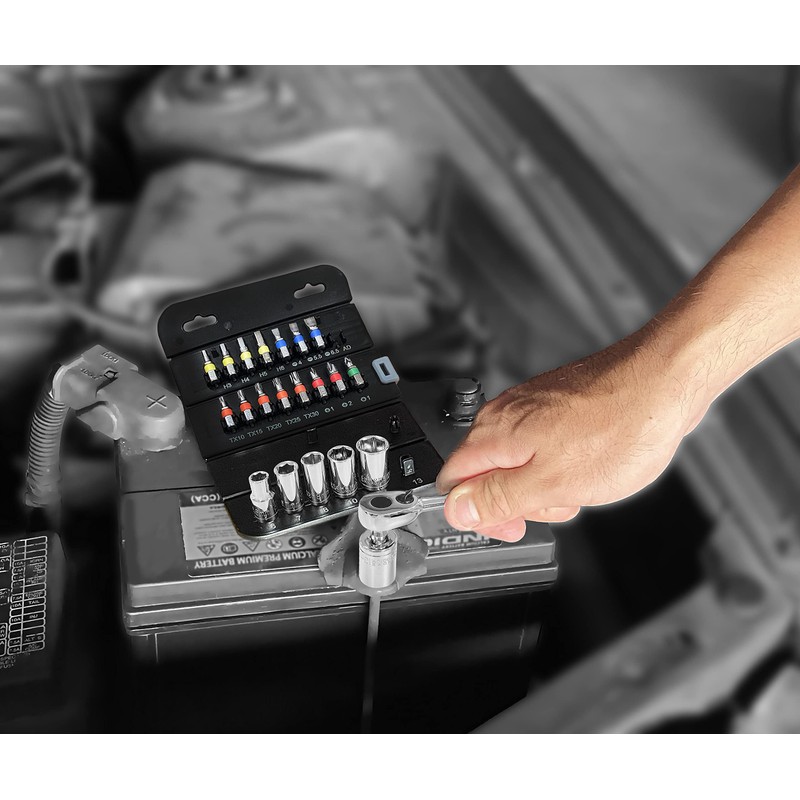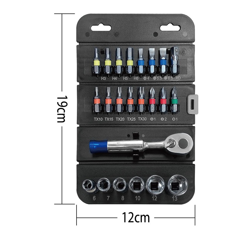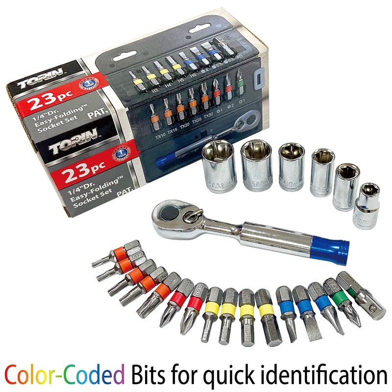 • Package Contents:The impact bit holder adapts to power tool driver and 1/4" hex key.Easy-Folding Case;1/4" dual-drive high torque ratchet; slotted bits: 5, 6mm; phillips#1,#2; Torx: T10, T15, T20, T25, T30; slottet bit