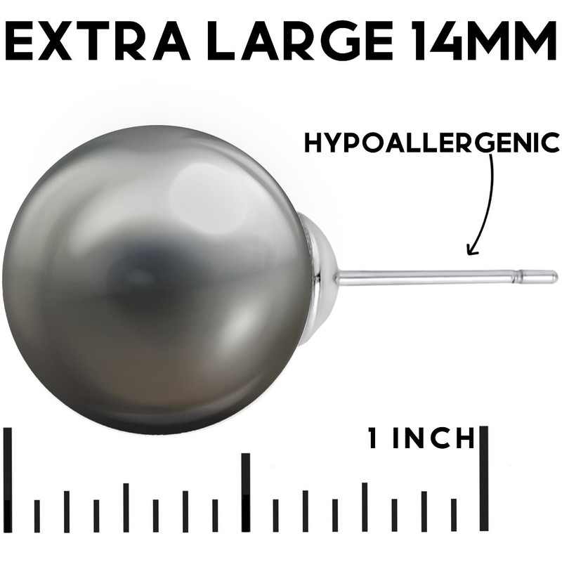 Giant pearl earrings are sure to make a statement and these large stud earrings for women or oversized pearl earrings for women are a classic choice. Add these simulated big pearl studs earrings for women to your everyday style, or give these big pearl stud earrings for women as the perfect gift for a best friend, wife, mother, relative, bride or a bridal party. Mounted on a classic stud earrings post, these oversized classic faux round large ear studs offer endless versatility and can be easily dressed up or down. These small black pearl earrings have hypoallergenic stainless steel posts. Shop our large pearl studs earrings for women, featuring 14mm pearl earrings and large pearl stud earrings hypoallergenic styles. Choose from big pearl earring large studs and extra large pearl earring studs, as well as pearl earrings for women, big earring pearls, big pearl earring studs, faux pearl studs and elegant big round pearl earrings. Available in multiple big and large sizes, these dark grey pearl earrings in silver are perfect fake pearl post earrings for women. A gift for those who love big stud earrings for women, fake pearl earrings, oversize earrings with fake pearls, pearl statement earrings, womens pearl earrings, silver and pearl earrings, black and pearl earrings, earrings silver black pearls, simulated pearl earrings Tahitian grey pearl earrings for women, black pearl earring, earrings black pearls, and grey pearl earring. Wear them as classy accessories for a romantic wedding, a pageant, or wear them as fantasy cosplay or a costume. For pierced ears. Our packaging design, perfect for gifting in a cute gift box or a reusable pouch, will make an elegant present for a birthday, anniversaries, Valentine's Day, Mother's Day, Christmas, Hanukkah / Chanukah, or the holiday gift giving season. This special gift will show your love and friendship to your wife, mom, daughter, grandmother, best friend, bridesmaid or bridal party. High quality costume jewelry.