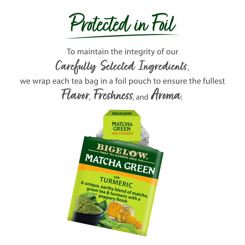 - Smooth and Spicy: 108 green tea bags of Bigelow Matcha Green Tea with Turmeric, a unique flavor experience of smooth green tea, vibrant matcha and spicy turmeric