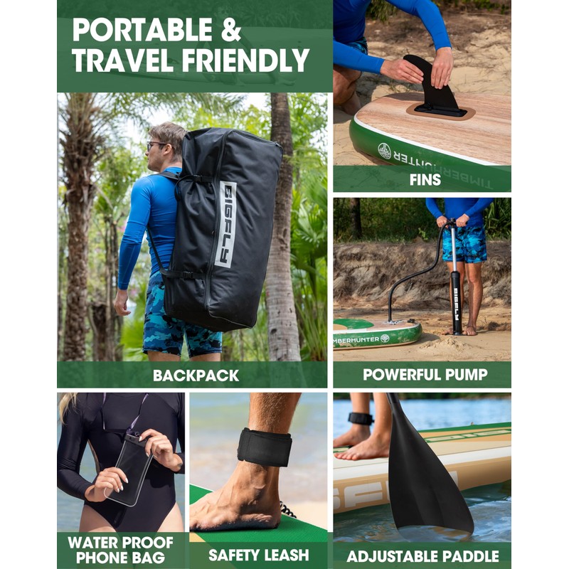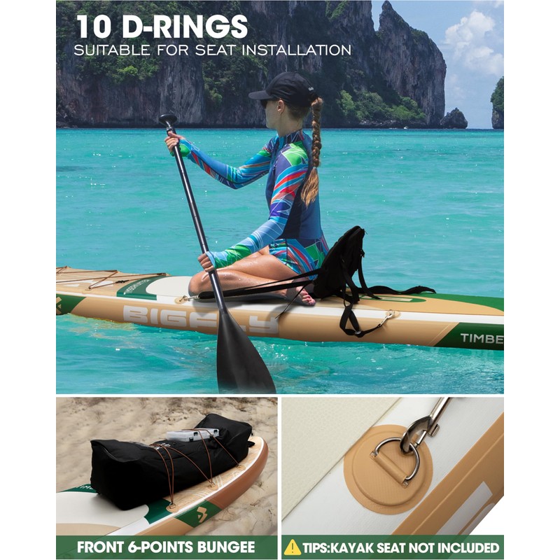 - 【Complete Paddle Board Accessories】Bigfly inflatable paddle board comes with all the necessary sup accessories to get started right away, including removable paddle board fins,1 adjustable paddle, 1 safety leash, 1 pump, 1 sup backpack, 1 waterproof phone bag. There are D-rings on sup board, which add functionality such as installing a kayak seat for fishing, securing a cooler or connecting with other inflatable sup through these D rings.