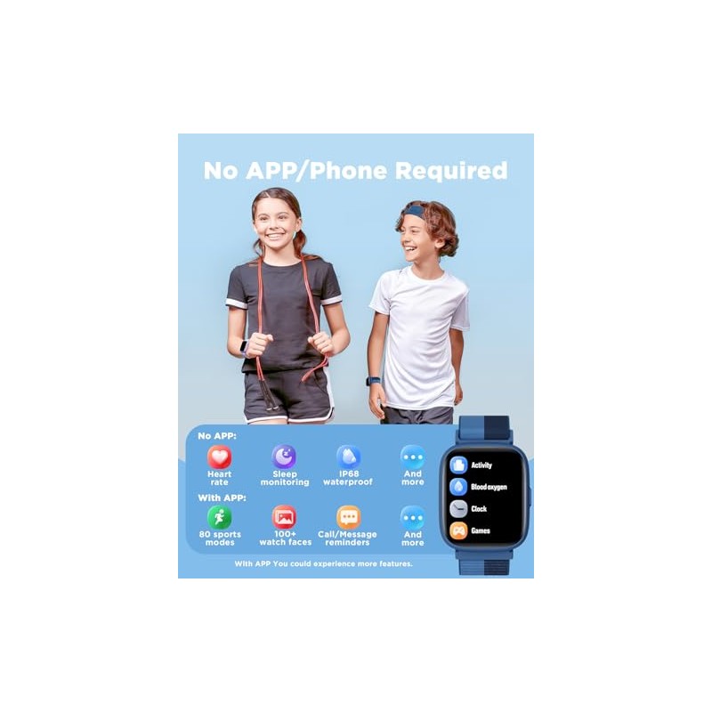 - All-Day Activity Tracking: BIGGERFIVE BRAVE 2 Smart Watch for Kids Teens Automatically counts steps, distance, calories burned, and active minutes. Supports 80 sports modes like walking, running, cycling, swimming(IP68 Waterproof), basketball, and more.