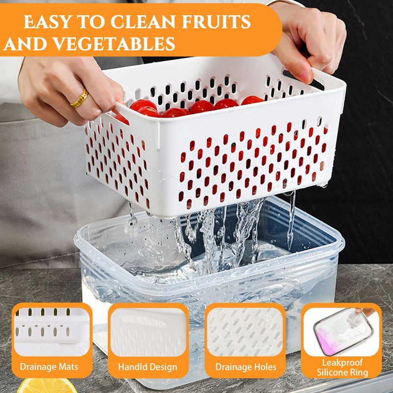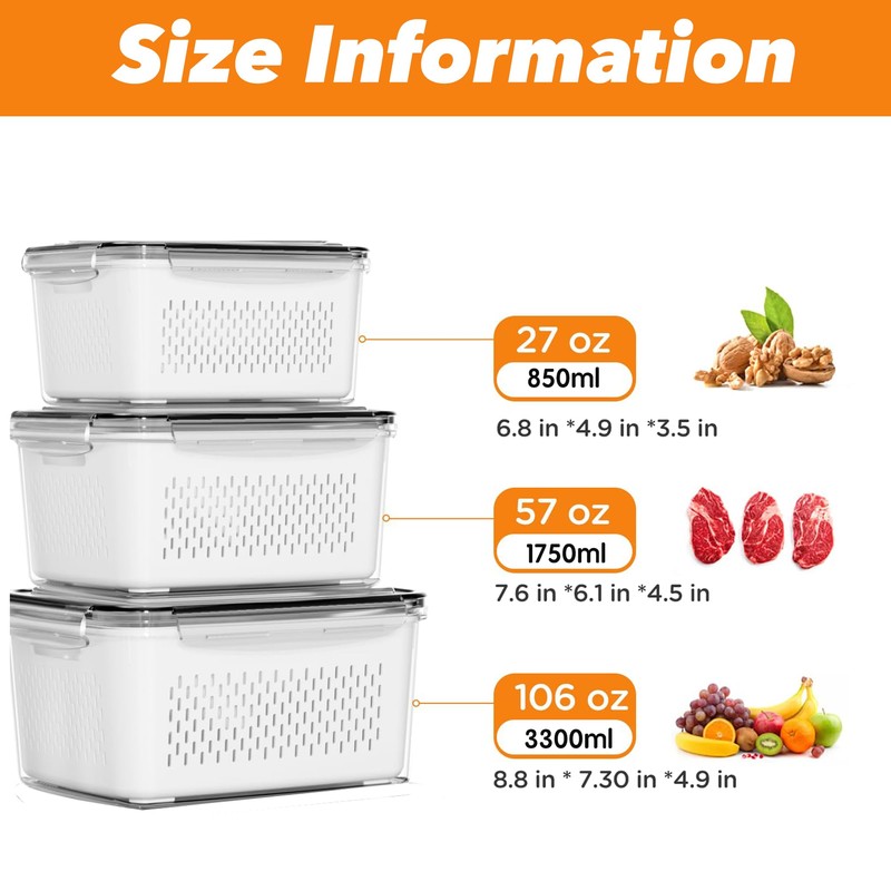 Bigingjia Food Storage Containers, Pack of 3, Fridge Storage Containers with Removable Strainer, Fruit Storage Containers for Fridge, Keep Berries, Fruit