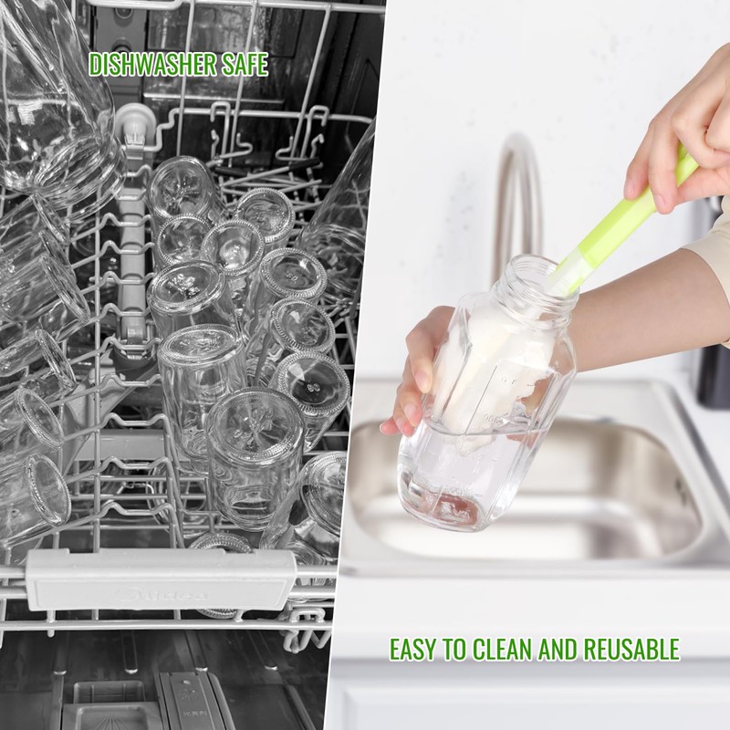 - Products Include: 4 pack 16 oz square milk bottles with lids and scale, 1 green sponge brush, 6 round stickers for marking your bottles
